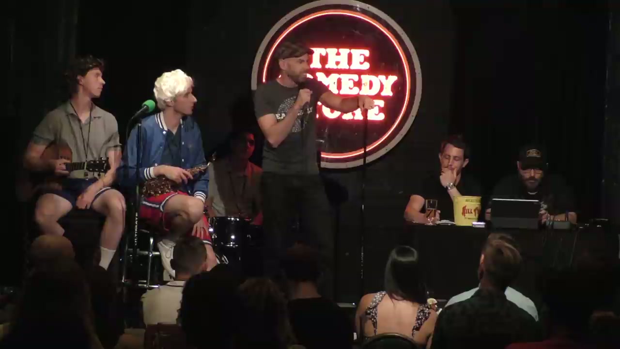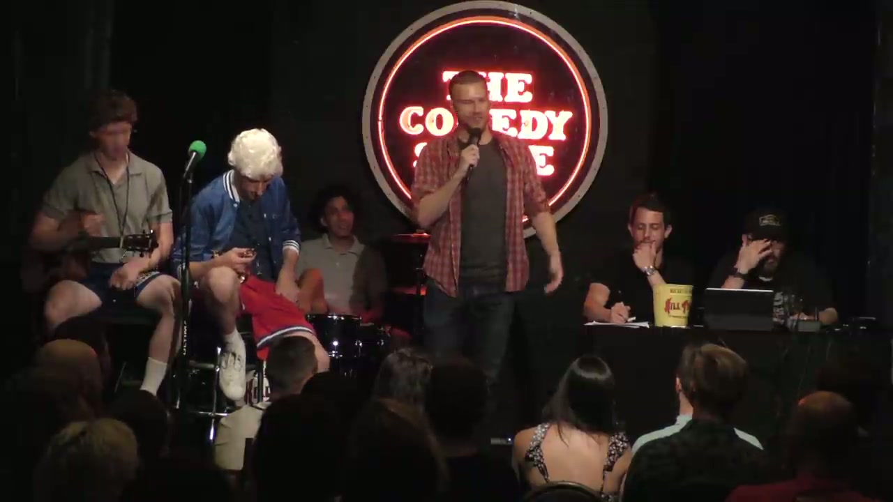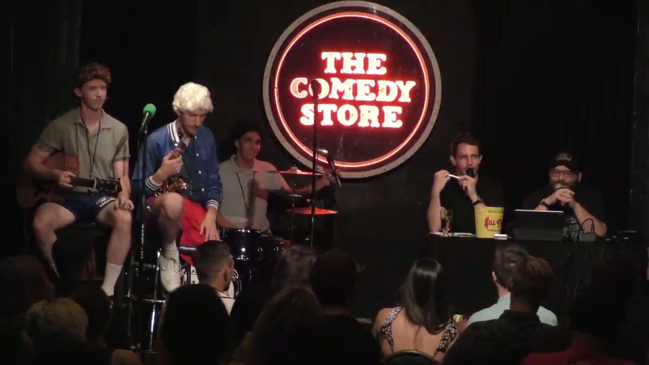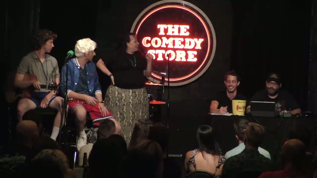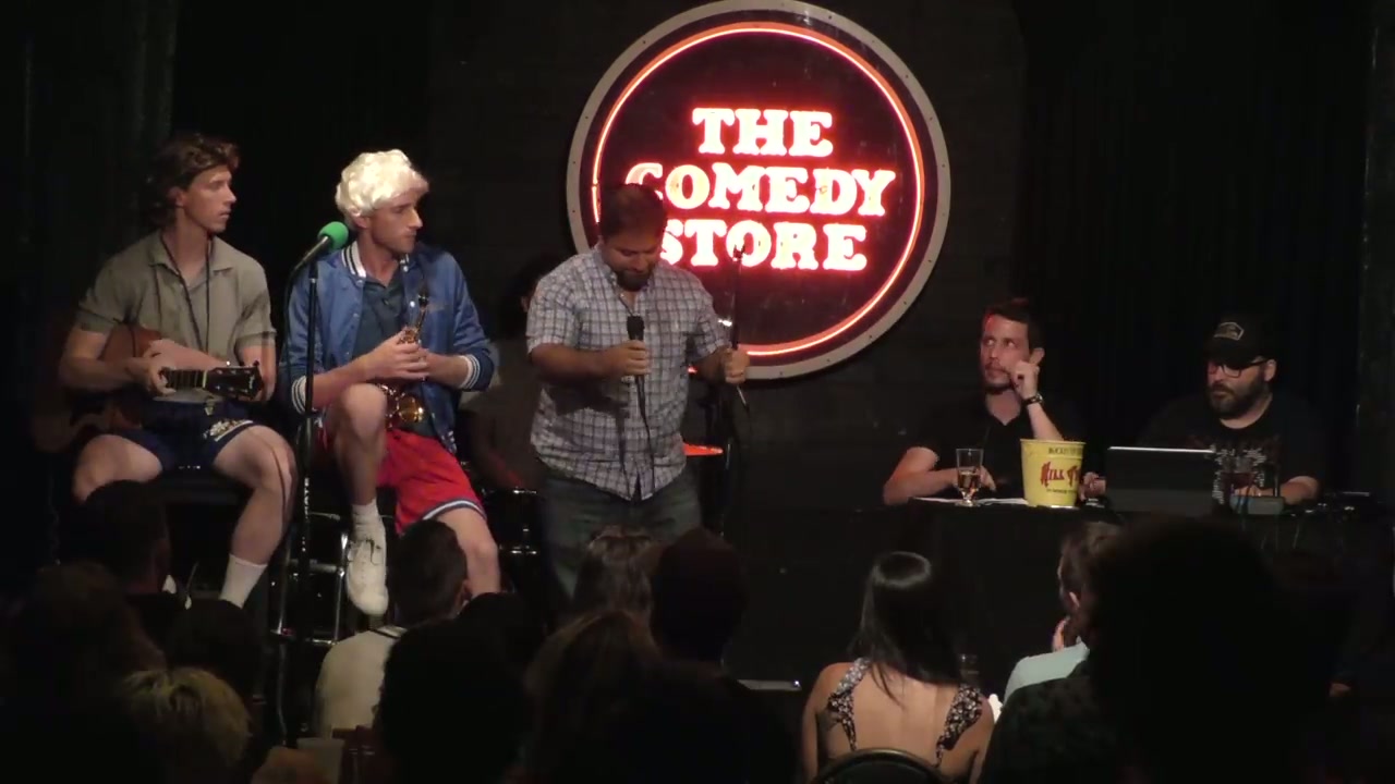 Live episode from La Jolla Comedy Store featuring bucket pulls, William Montgomery's surprise appearance riding an electric wheelchair, and coaches-themed band characters