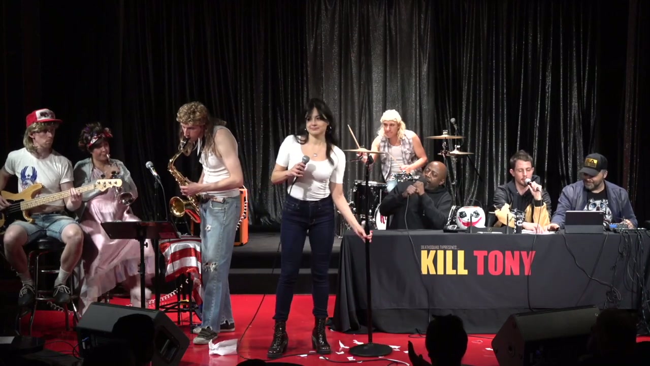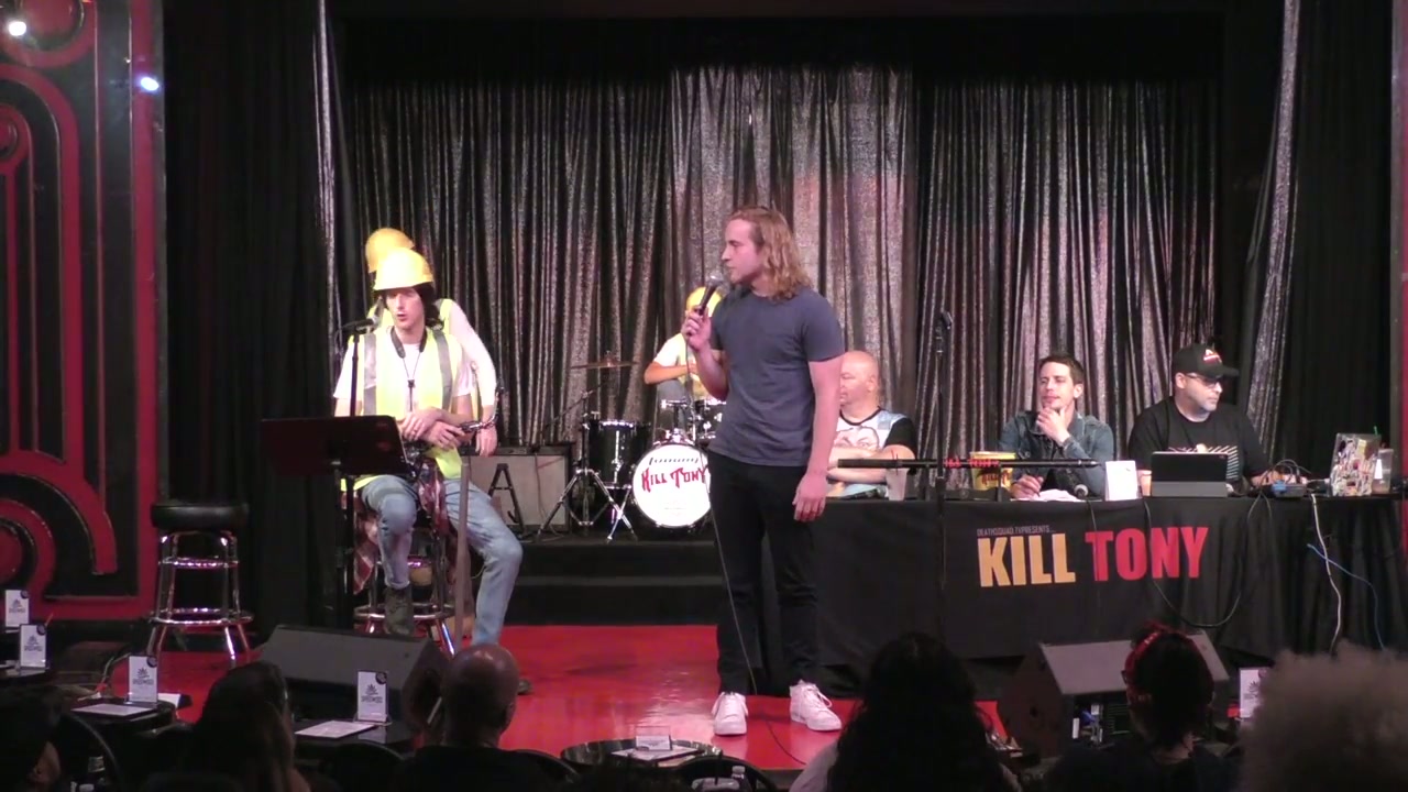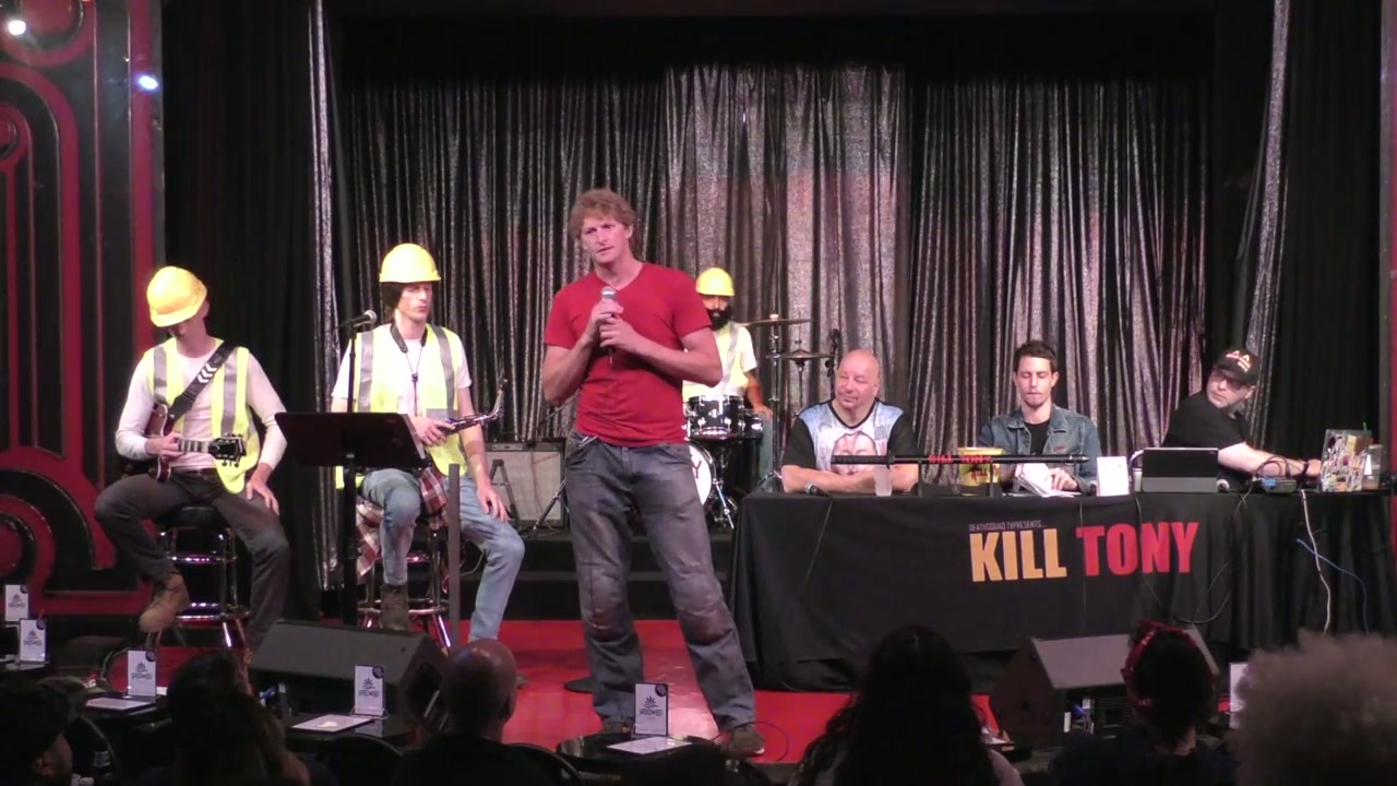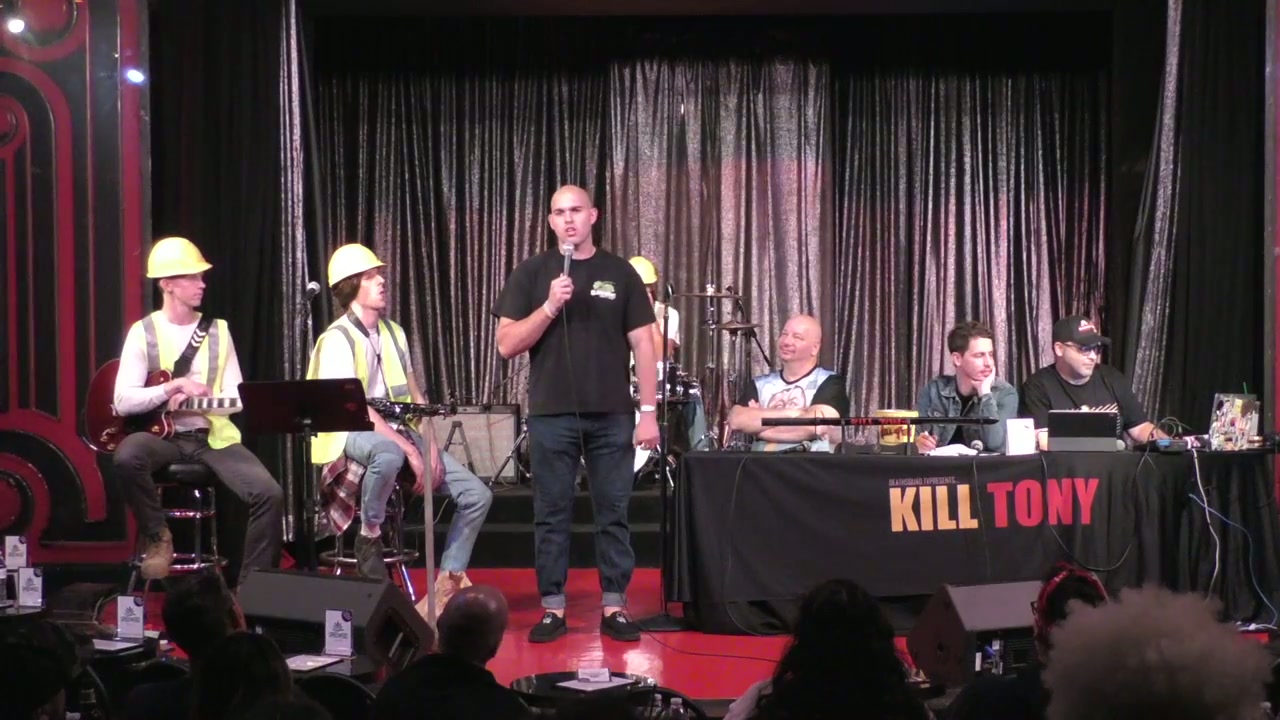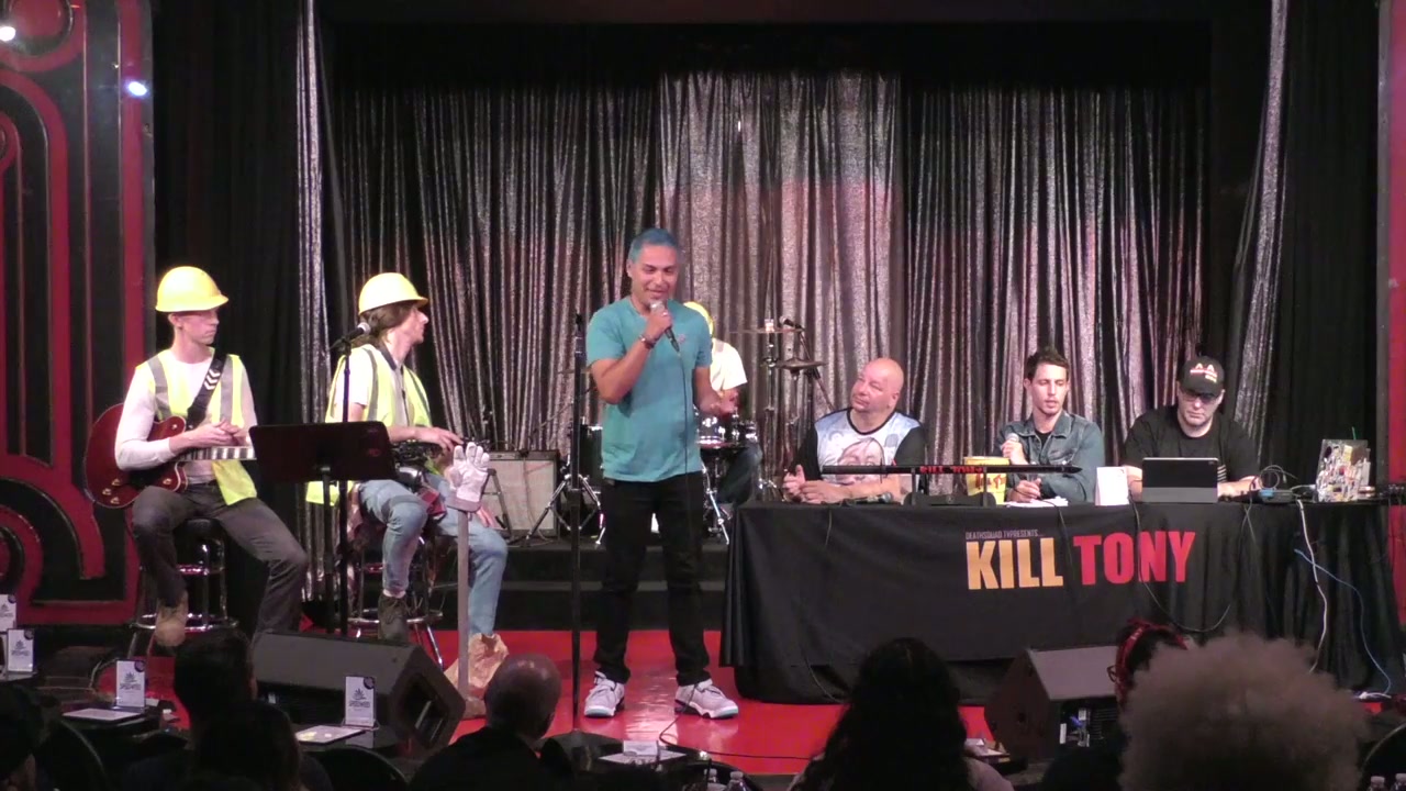 Tony Hinchcliffe hosts with guest Jeff Ross, featuring the Kill Tony band in construction worker characters and bucket pulls from various comedians including discussions about relationships, personal struggles, and comedy journeys.