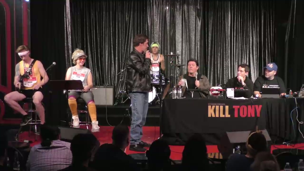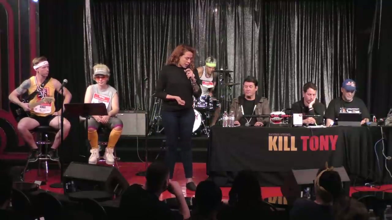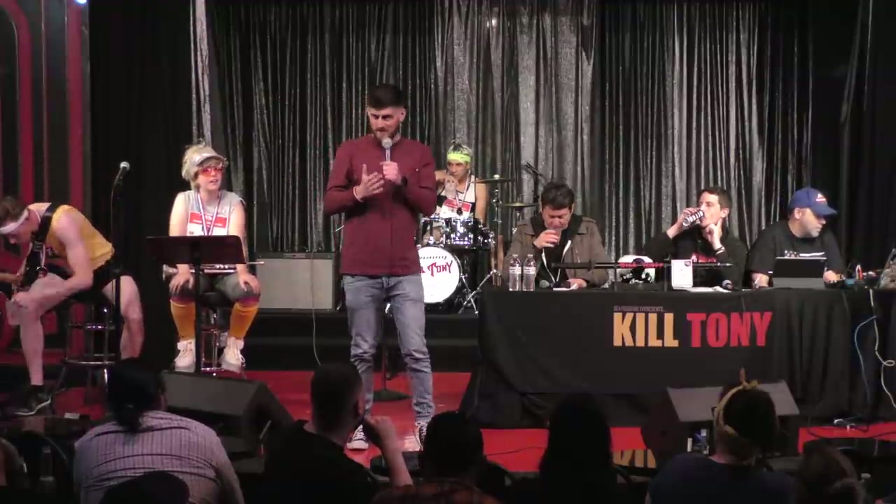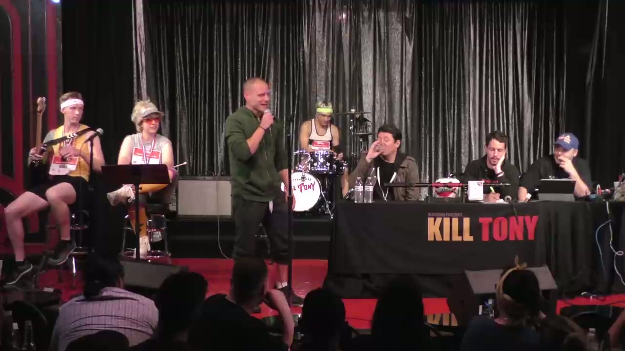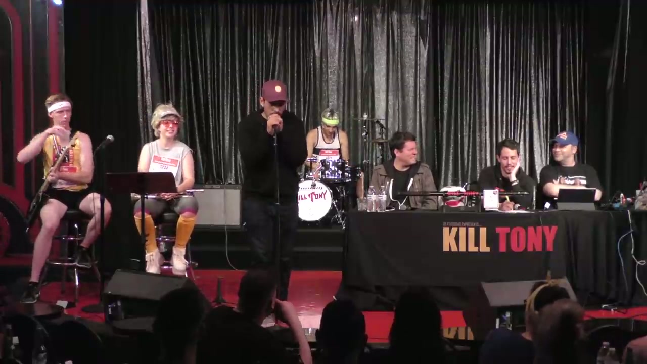 Tony and Doug Benson return from tour to host Kill Tony at the Comedy Store with track runner-themed band characters, featuring bucket pulls and regular William Montgomery