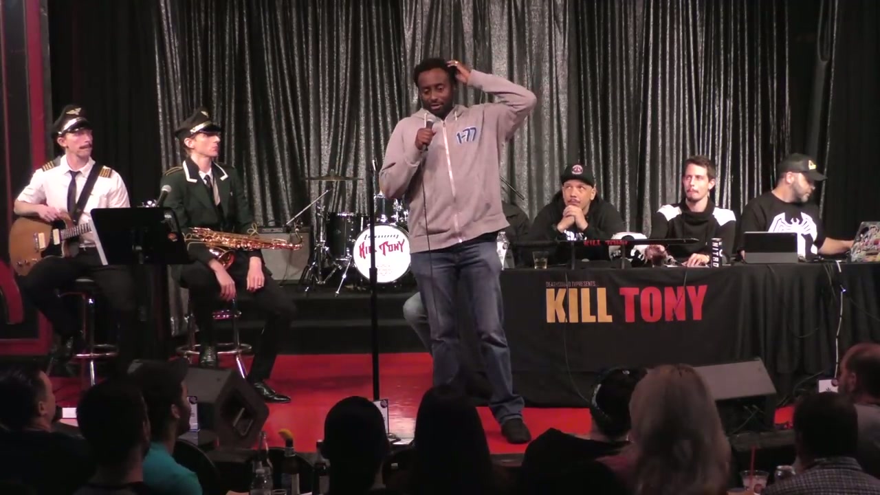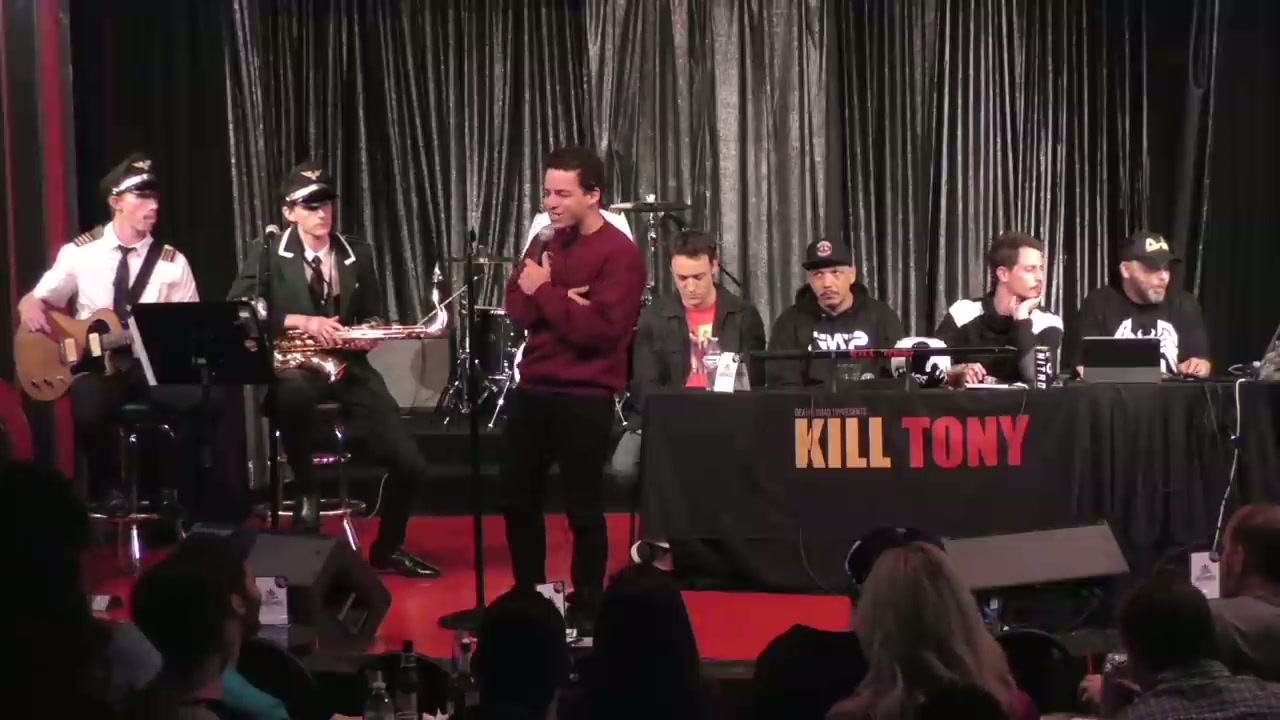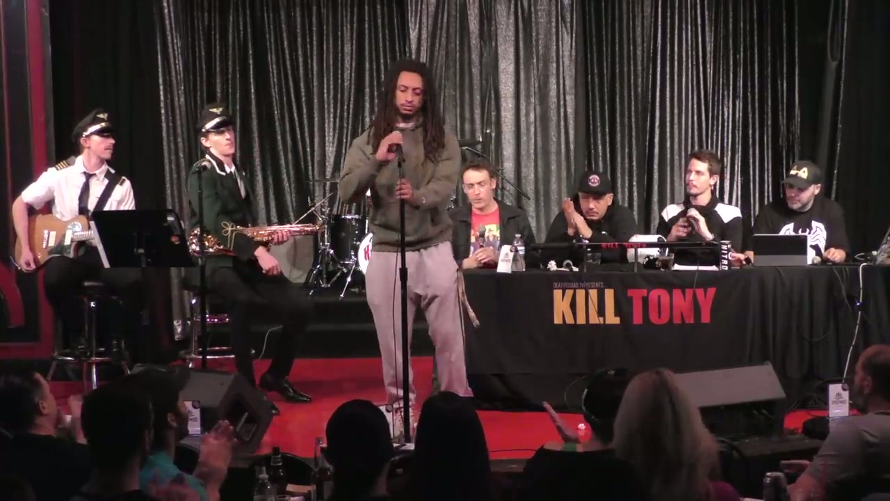 Live comedy podcast featuring Tony Hinchcliffe and guests Luis J Gomez and Dan Soder, with comedians pulled from a bucket to perform 60-second sets. Luis promises to send one performer to Skank Fest.