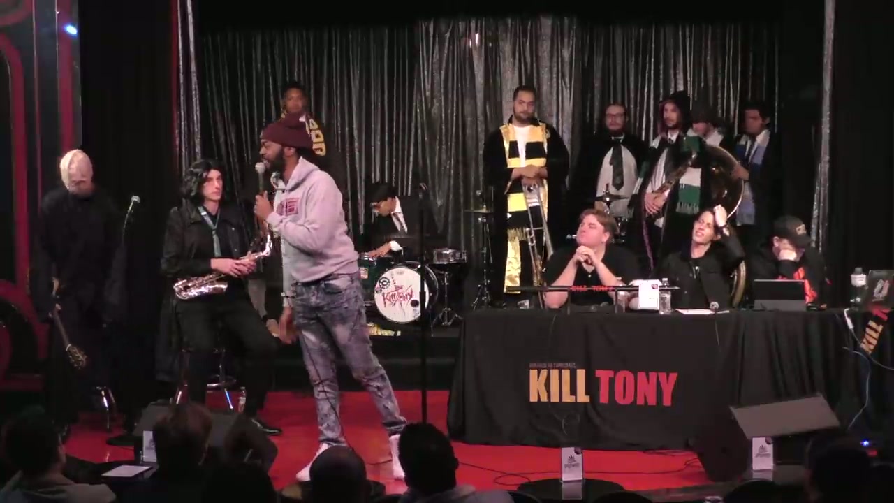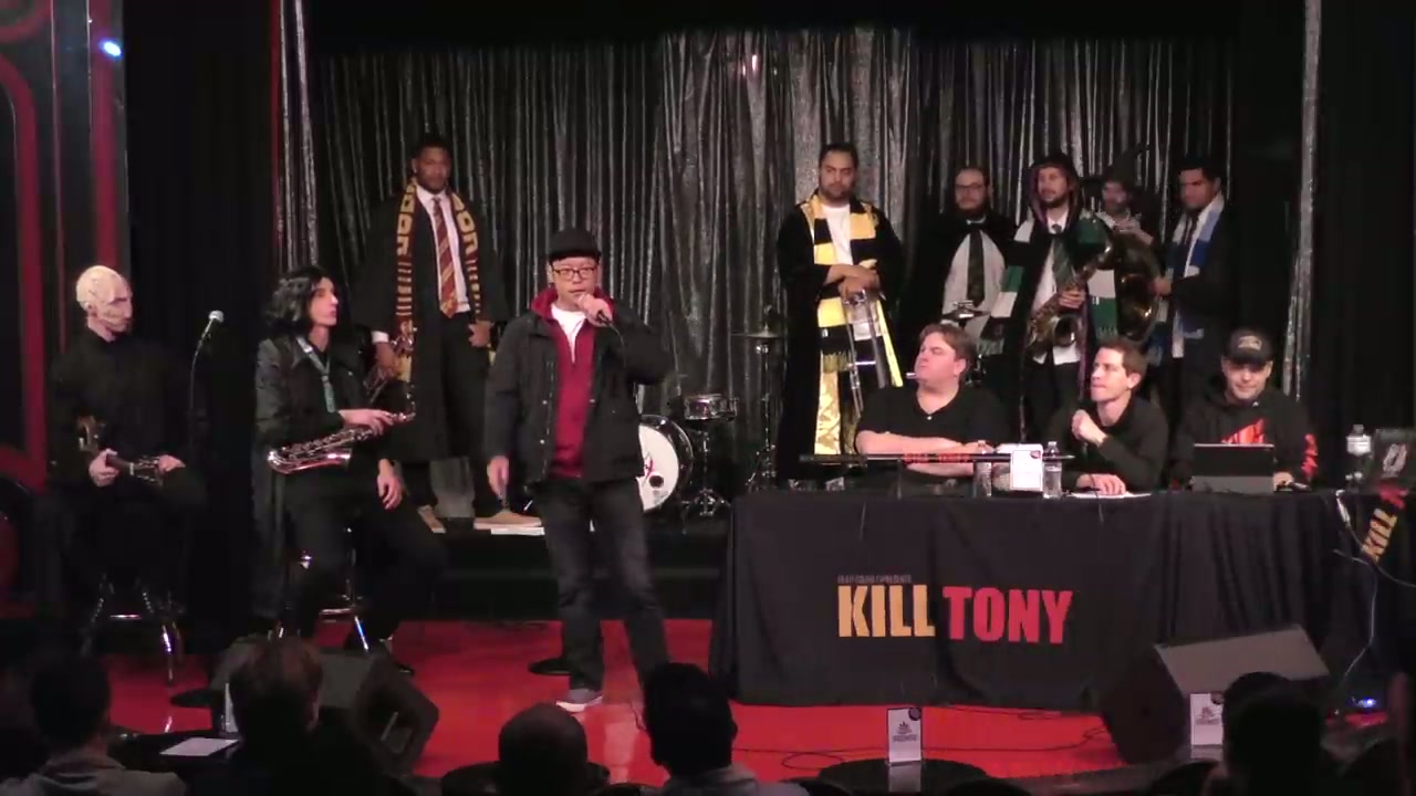 Tony Hinchcliffe and guest host Tim Dillon watch comedians perform and interview them, featuring regulars and bucket pulls with Professor Snape and the band