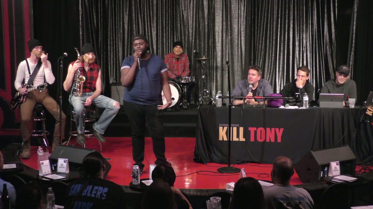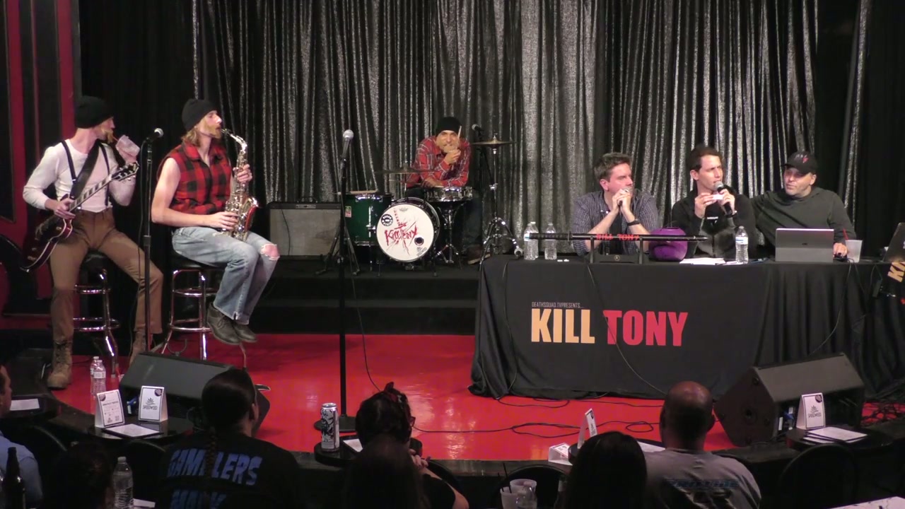 Tony Hinchcliffe and guest host Jesse Joyce interview bucket pull comedians with the Kill Tony band dressed as lumberjacks