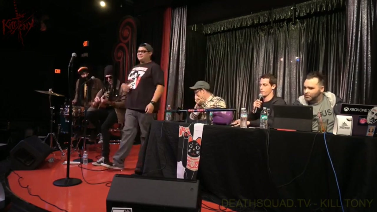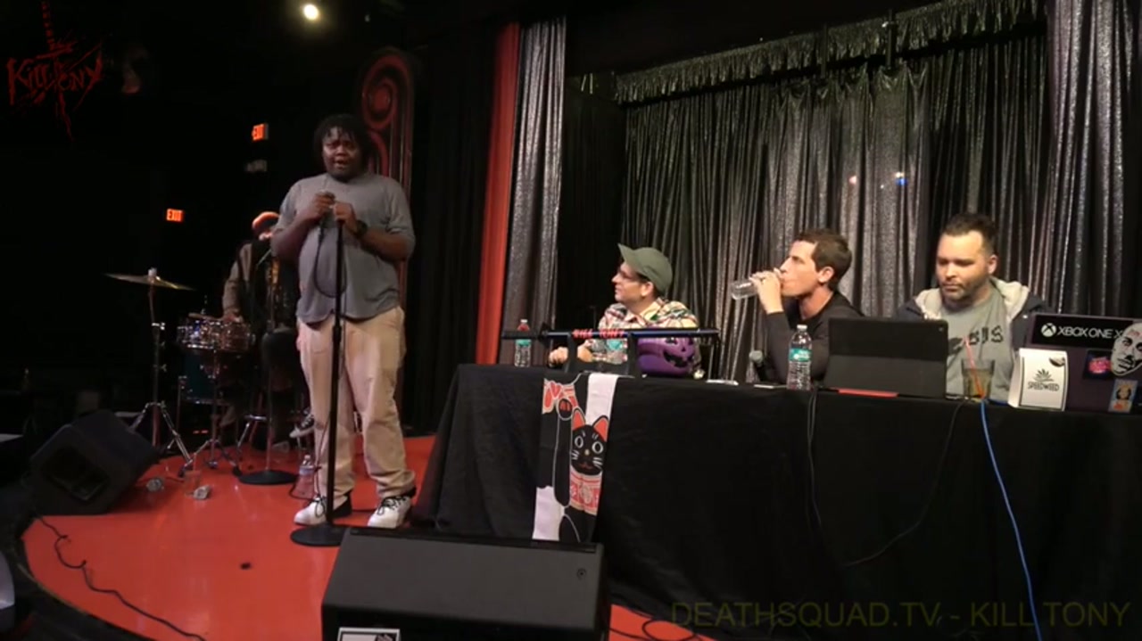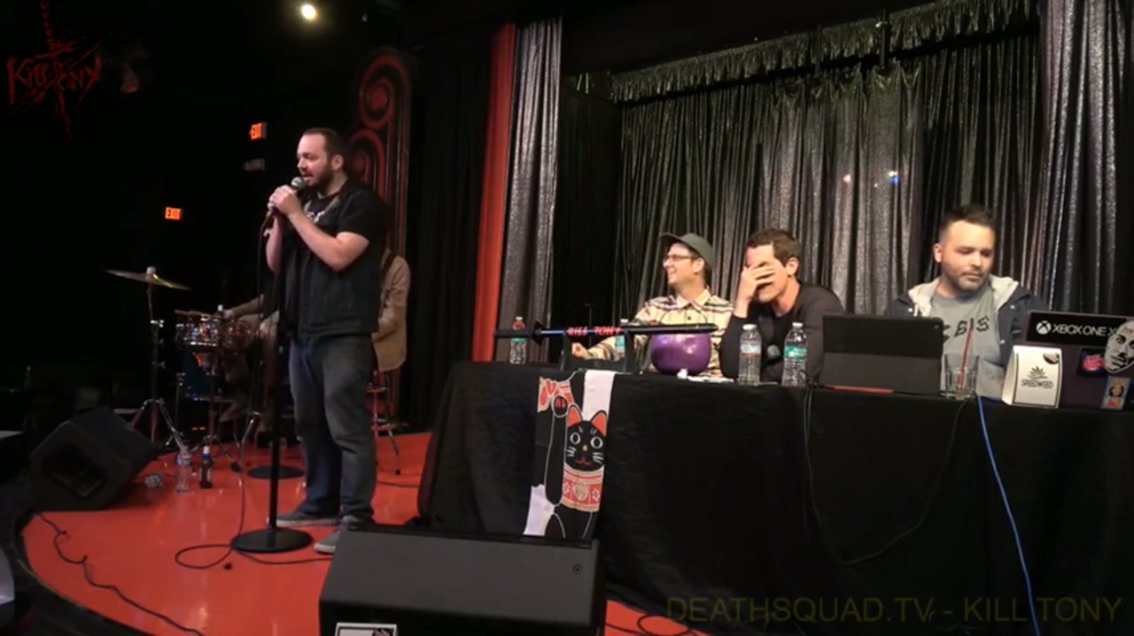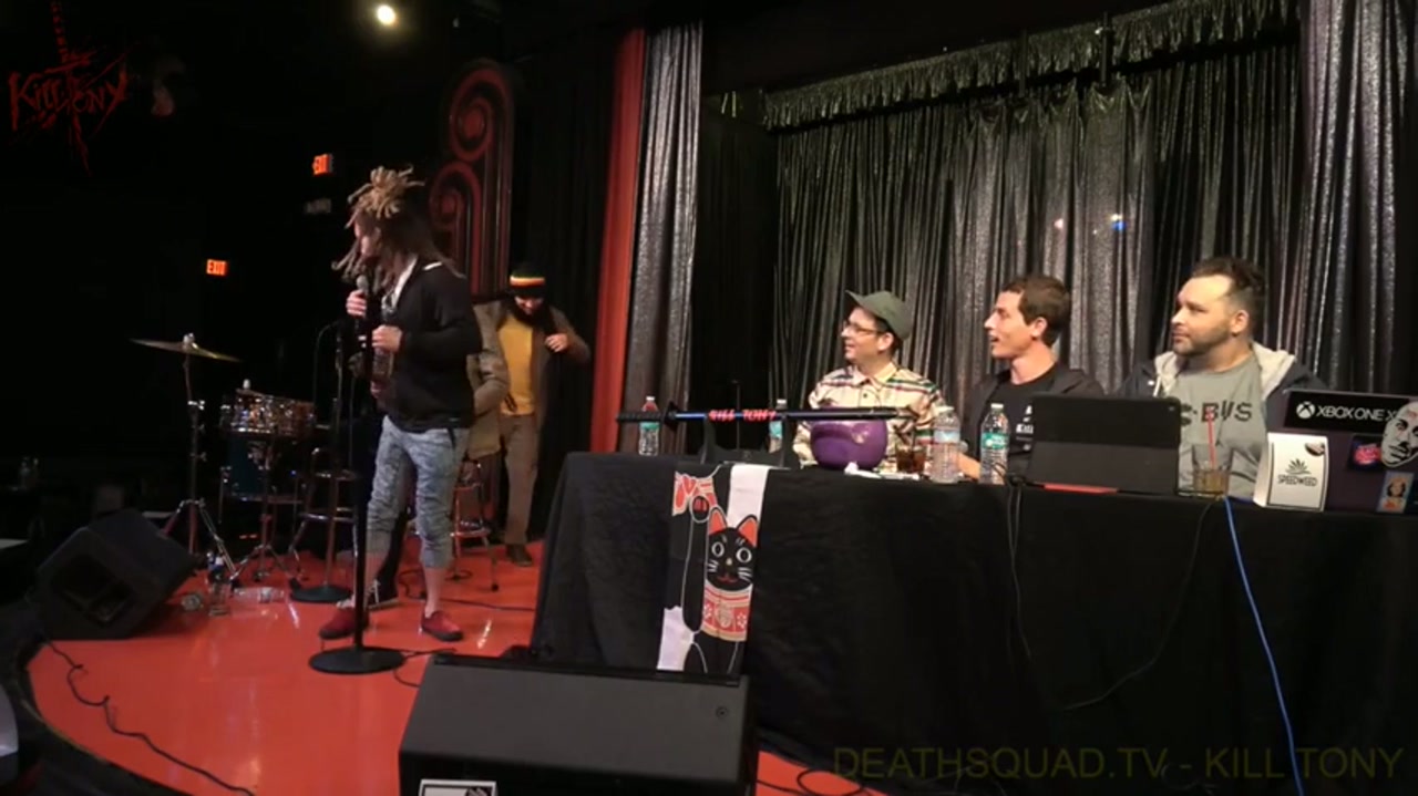 Tony and guest host Moshe Kasher interview comedians pulled from the bucket, featuring a mix of new and returning performers with stories ranging from camping mishaps to motivational speaking. The band commits to Jamaican characters with Pat Reagan and Joel Jimenez.