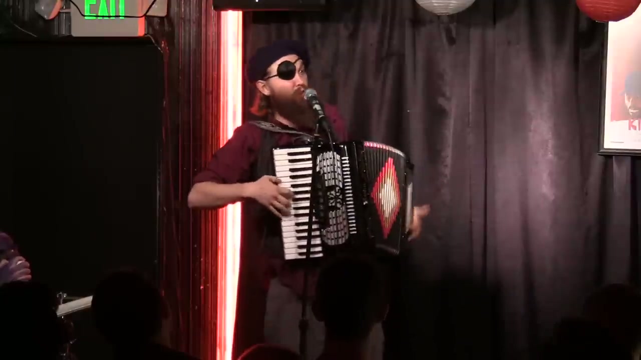 Character comedian from Wyoming/Colorado, lives in RV with two cats, plays accordion