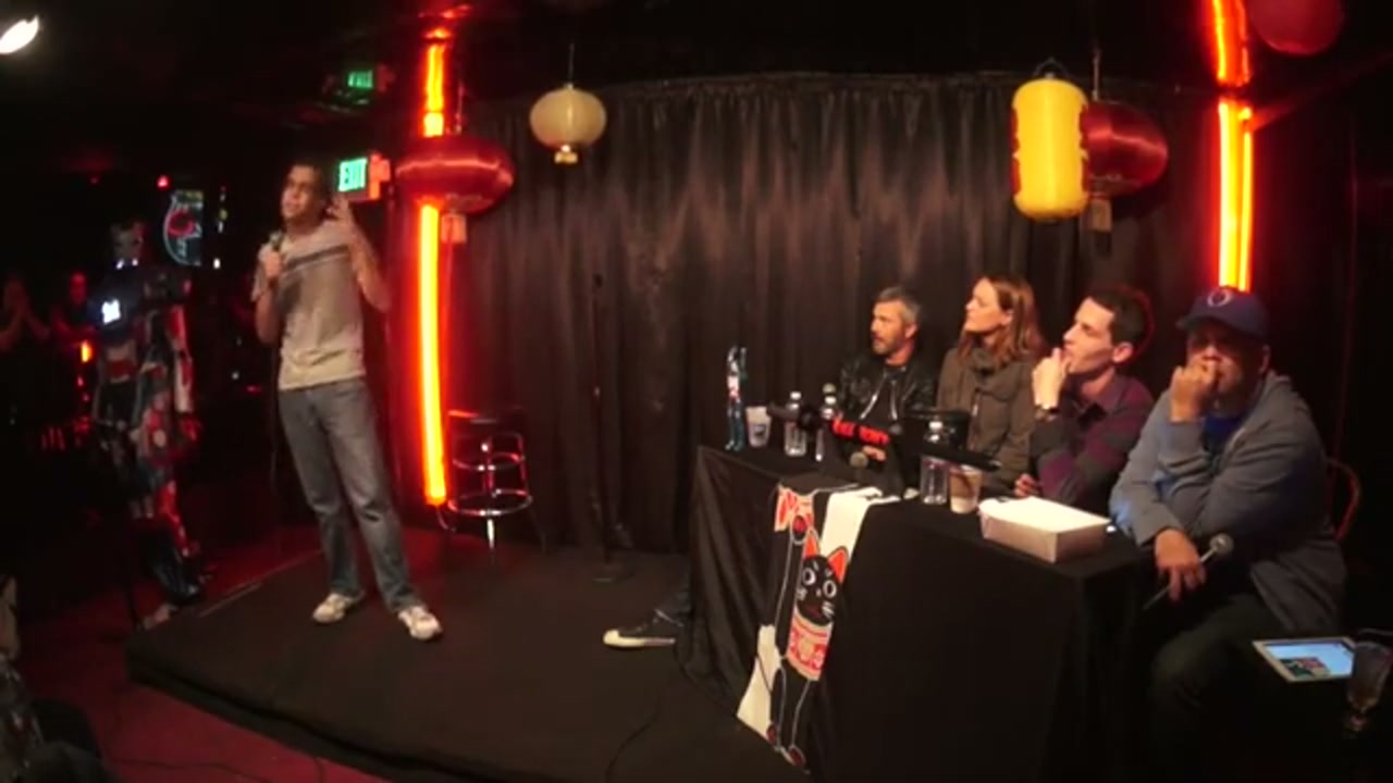 Tony hosts with guest hosts Sarah Tiana and Cort McCown, featuring bucket pulls from Scotland, China, and first-time comedians performing at the Comedy Store