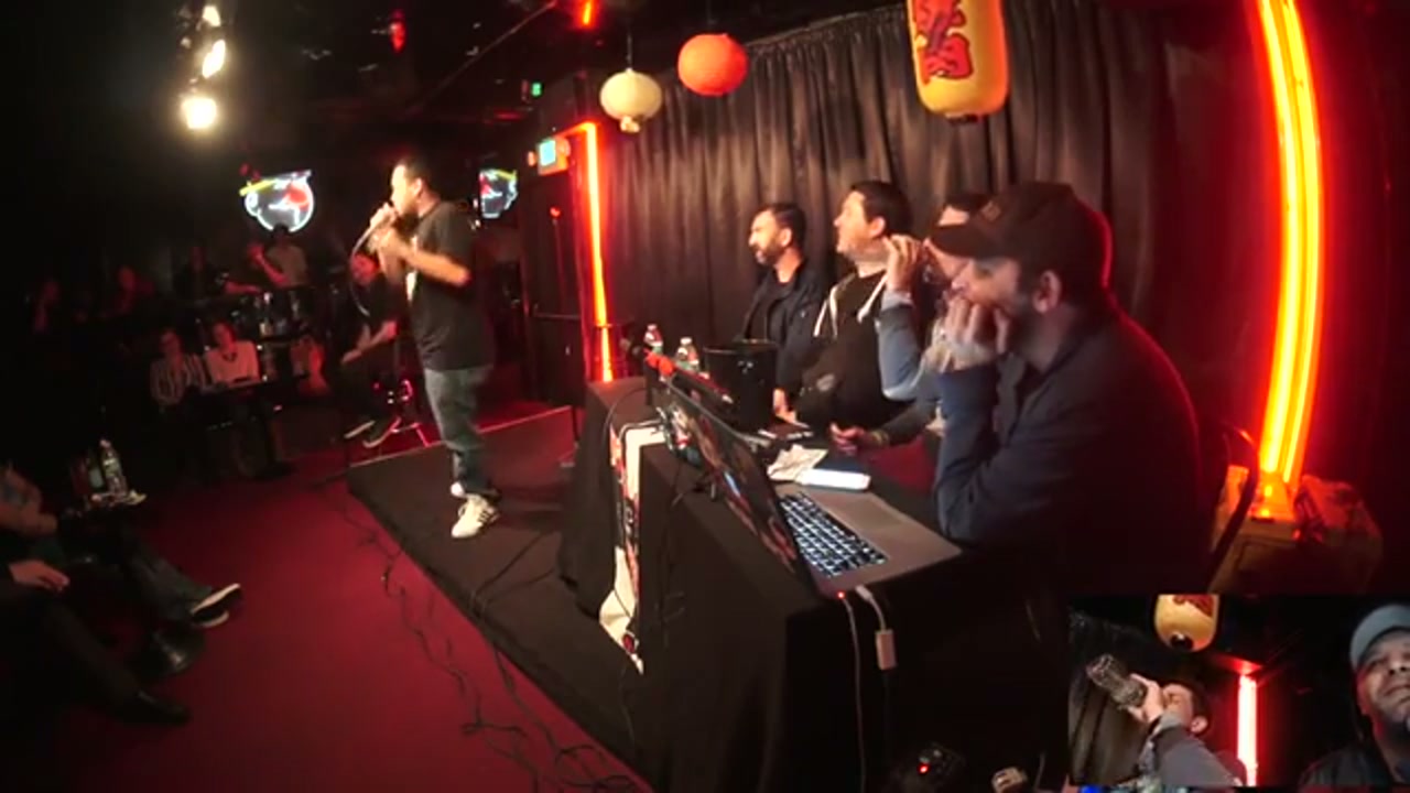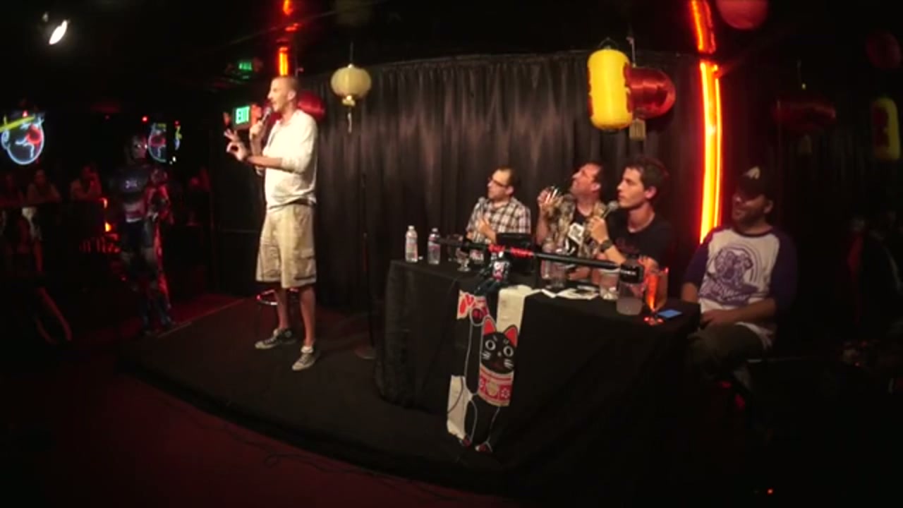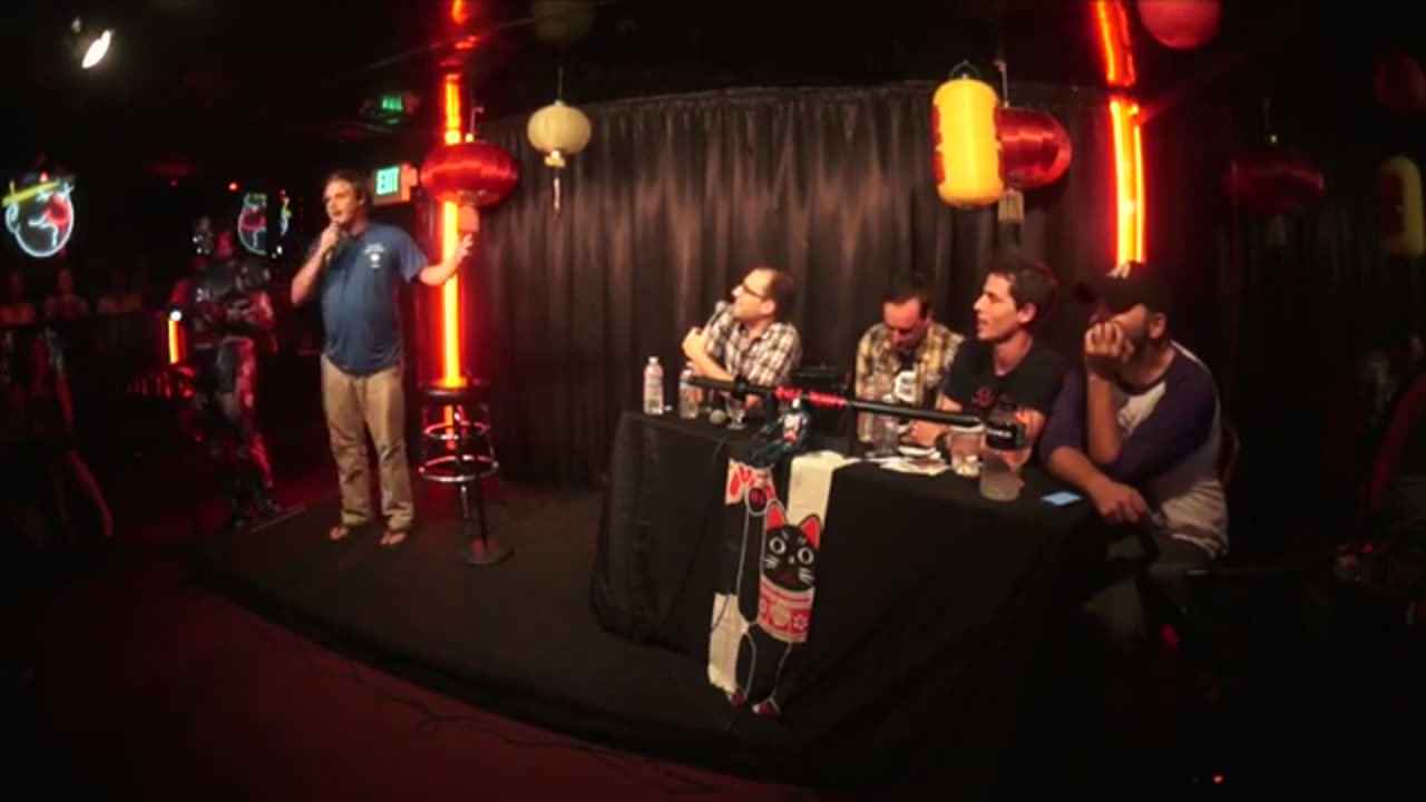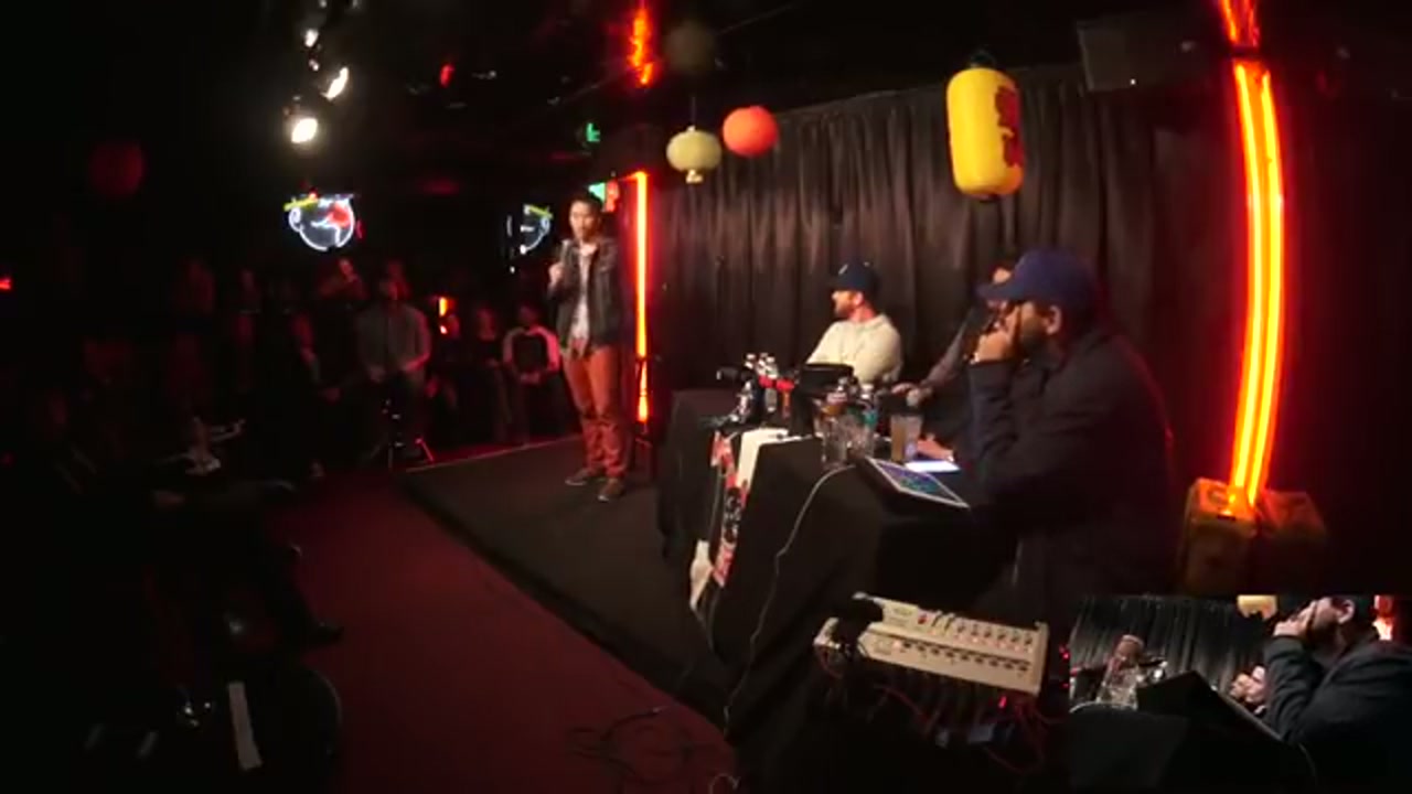 Episode featuring guest hosts Louis Katz and Matt Fulchiron, with regular performers and bucket pulls including topics ranging from Asian stereotypes to dating apps, plus food by chef Elise Lane