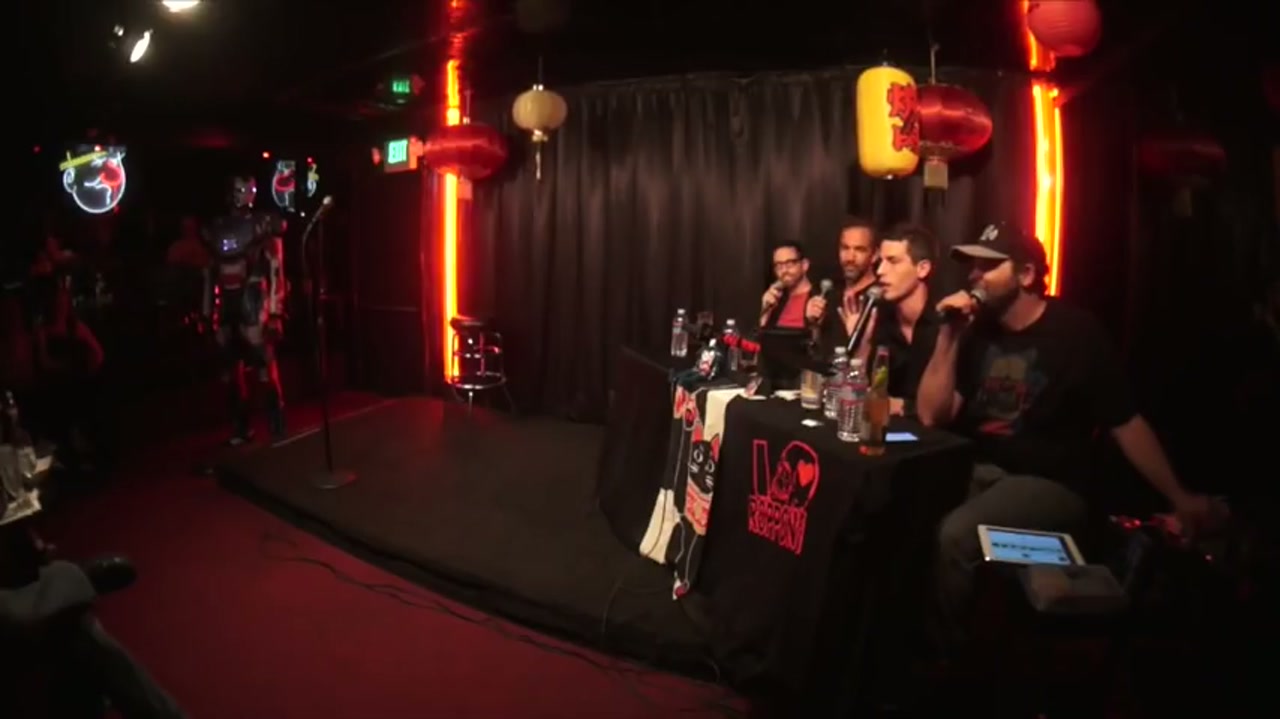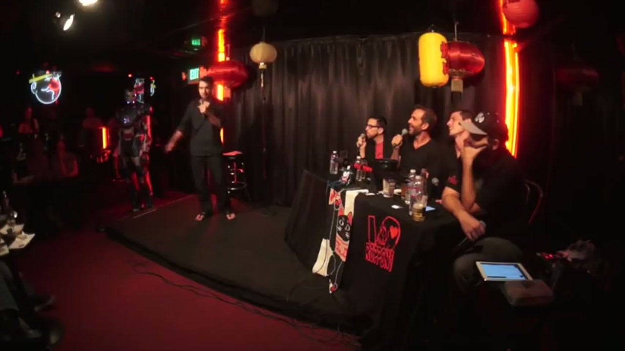 Live comedy podcast featuring guest hosts Neal Brennan and Bryan Callen, with comedians pulled from a bucket performing one minute sets, including several first-time performers