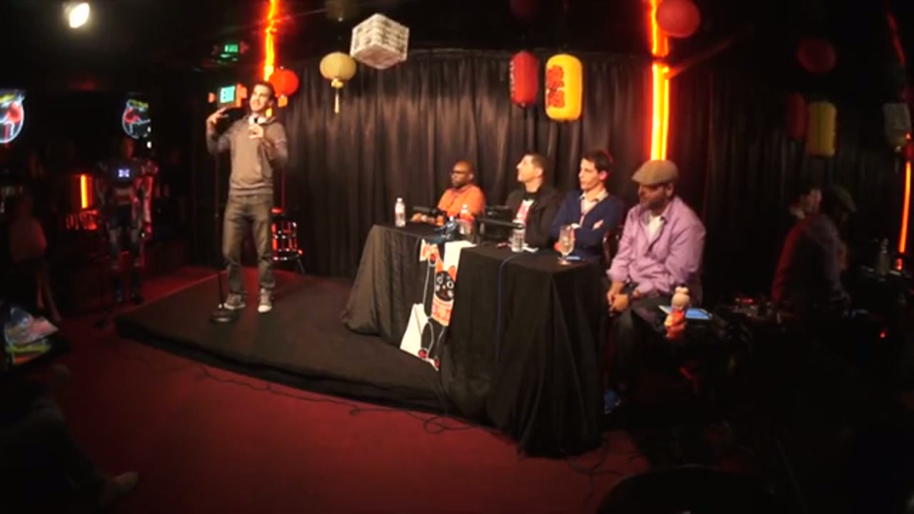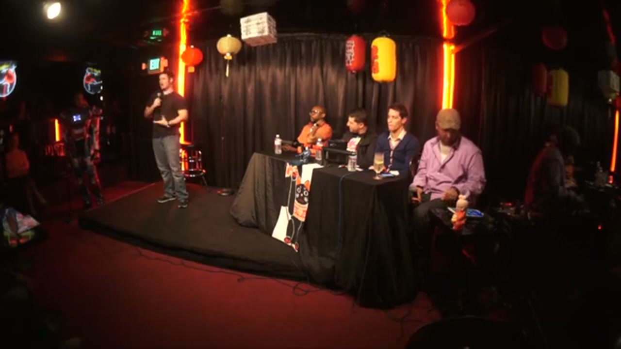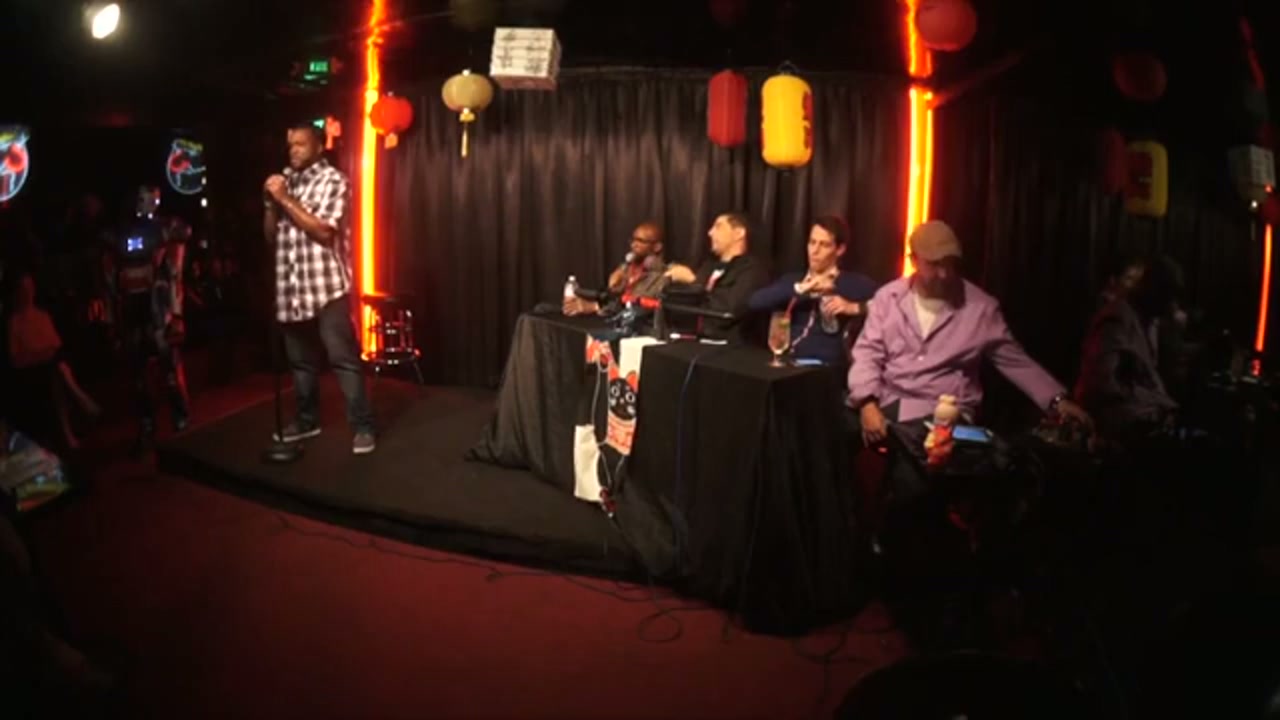 Tony Hinchcliffe hosts with guest hosts Sam Tripoli and Ian Edwards, featuring head of security Tiffany Haddish as Iron Patriot. Multiple bucket pulls perform one-minute sets followed by critiques and conversations.