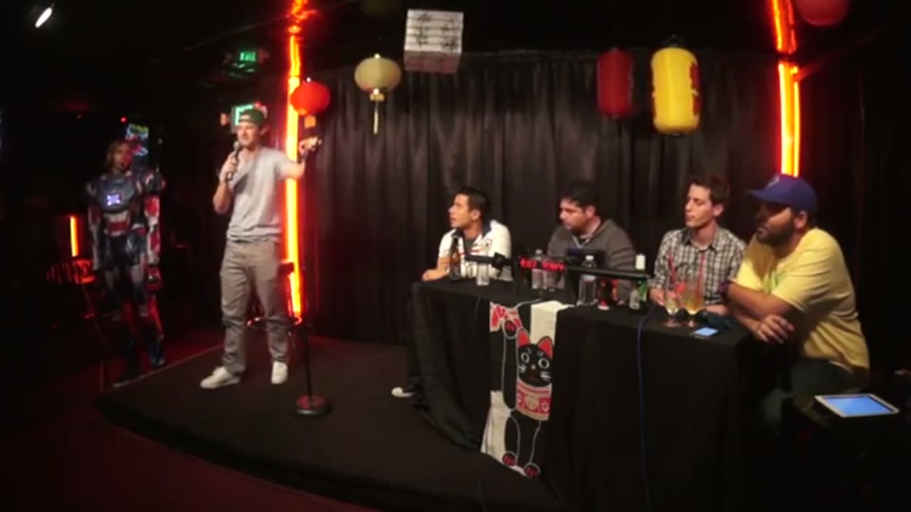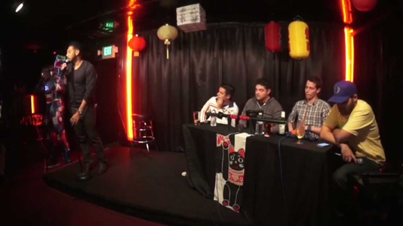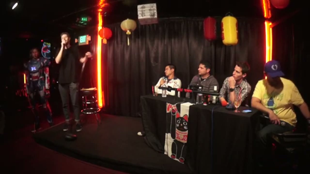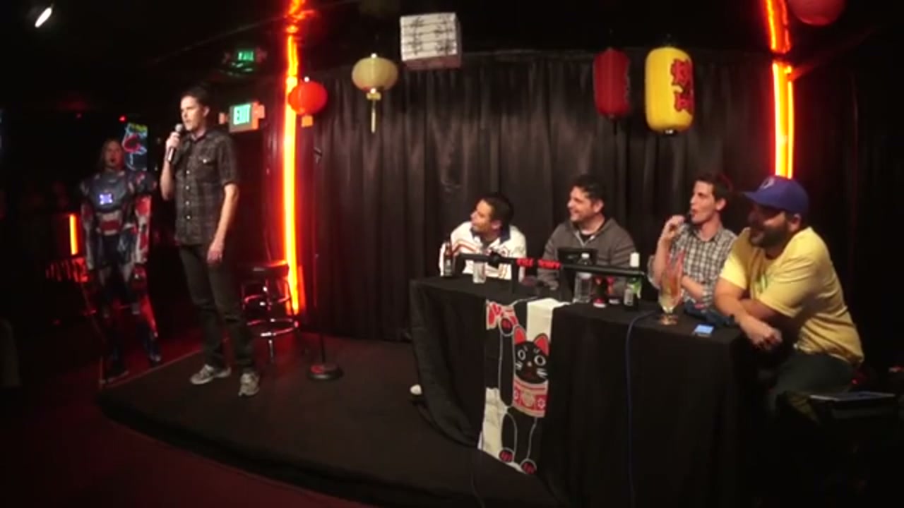 Live comedy podcast featuring guest hosts Francisco Ramos and Sandro Iocolano, with Jeremiah Watkins as head of security/Iron Patriot, bucket pulls from amateur comedians, and regular performers Kimberly Congdon and Sarah Weinshank