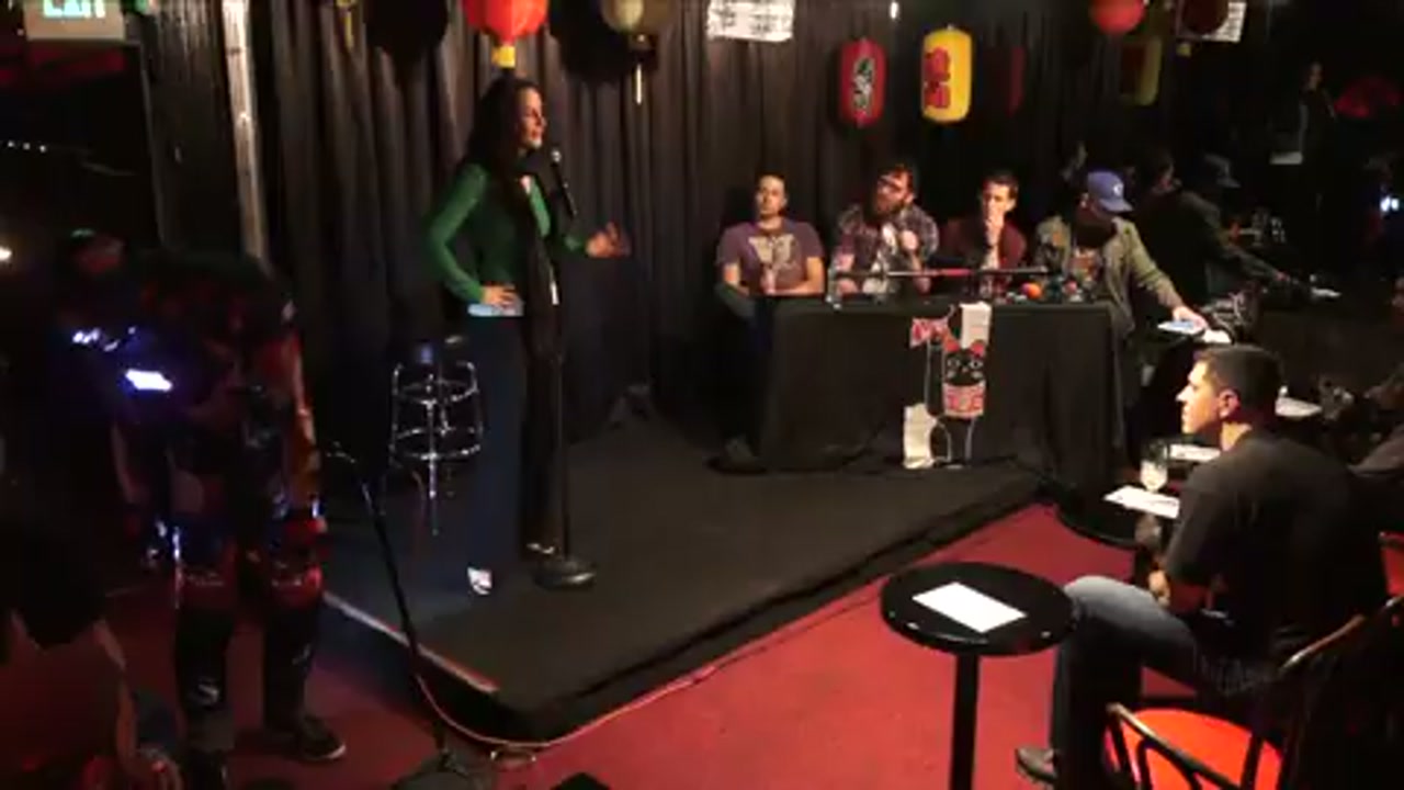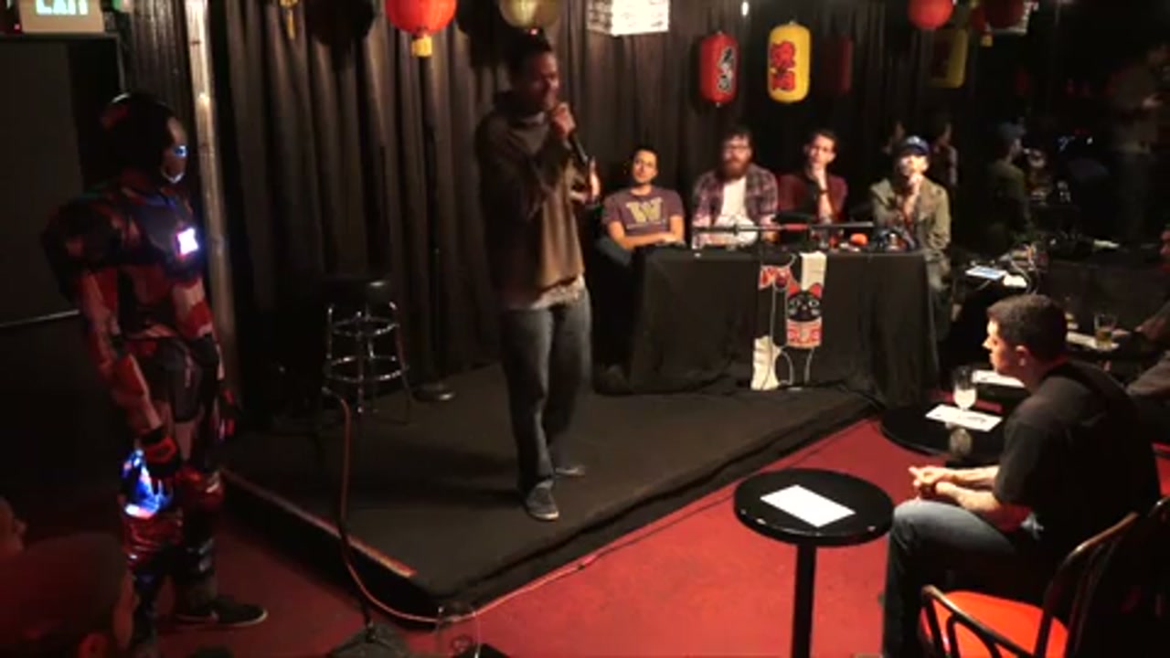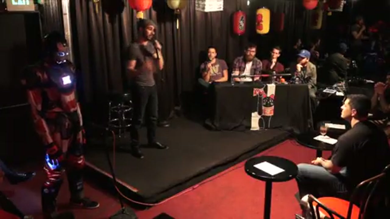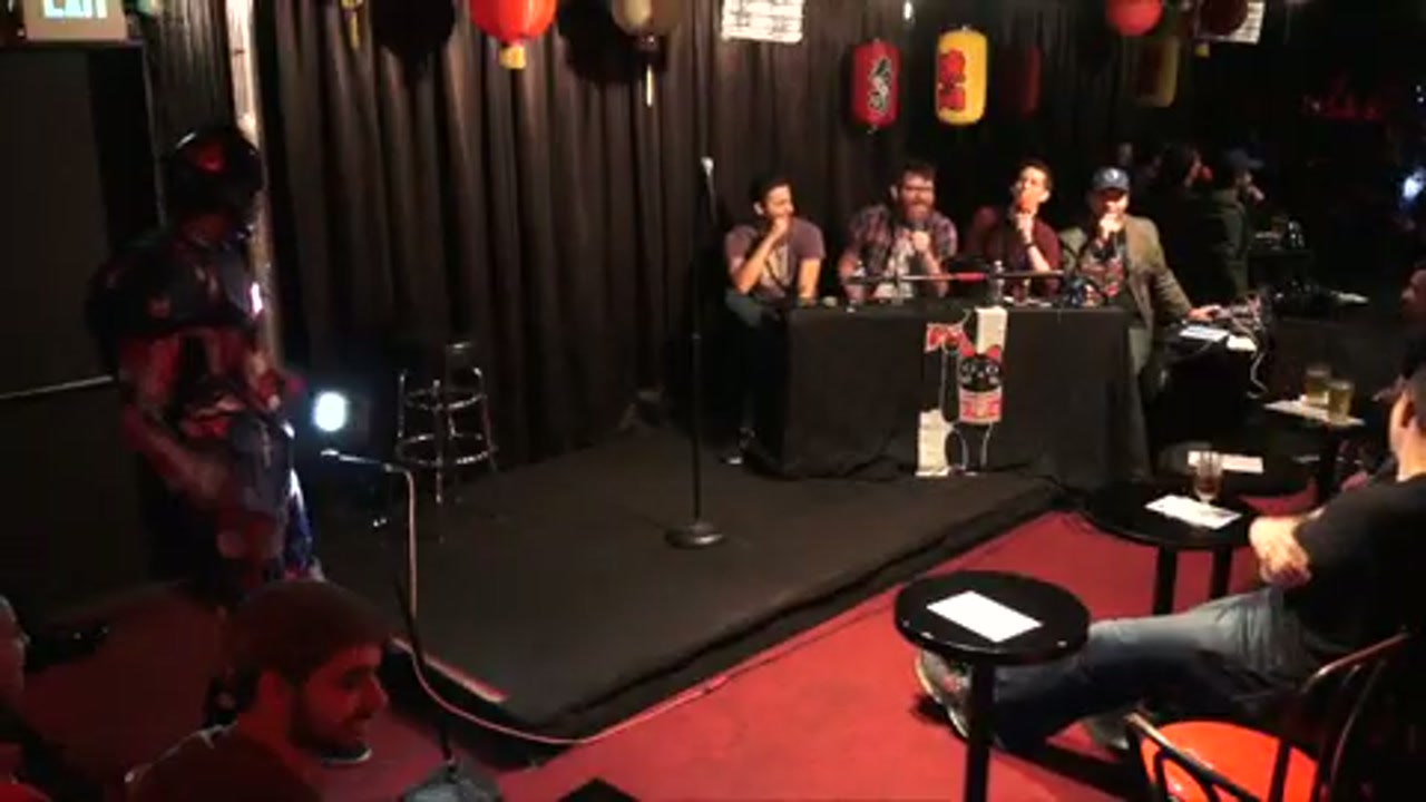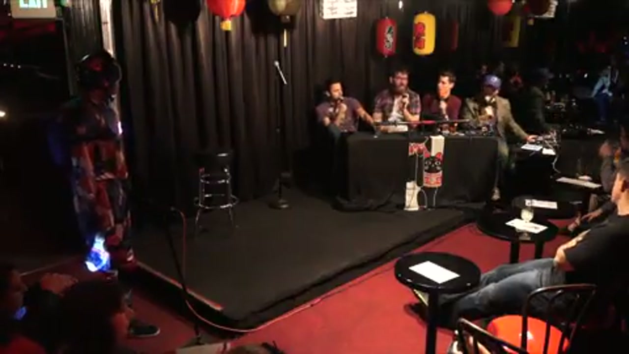 Episode featuring guest hosts Mike Lawrence and Fahim Anwar, with the debut of the Dark Patriot as the new head of security, and various bucket pulls including emotional relationship discussions and international comedians